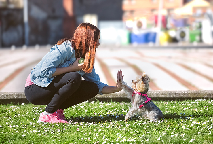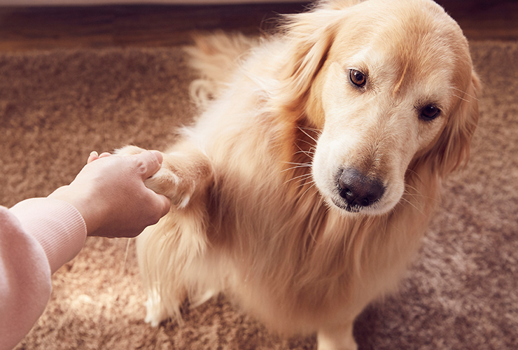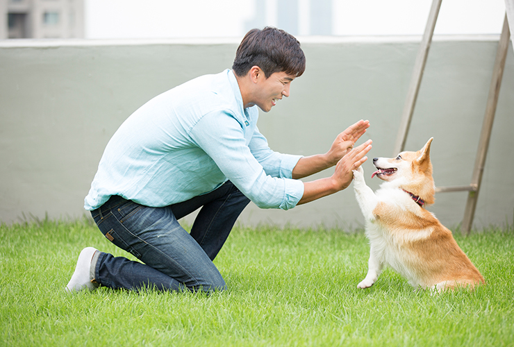 견주가 손! 하고 말하면 강아지가 견주가 뻗은