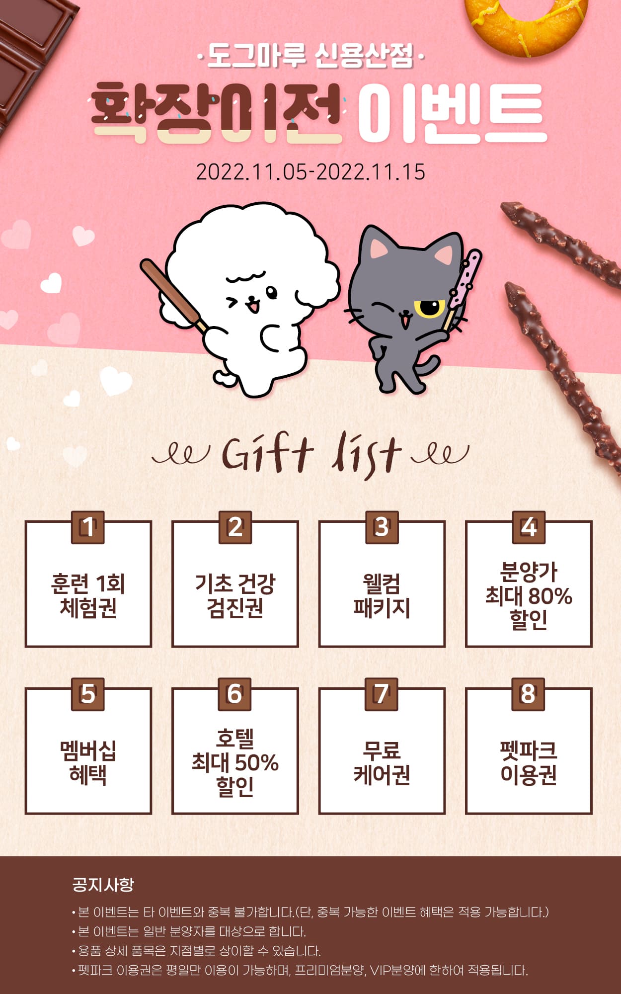 ✔ 최대 80% 분양가 할인 / 웰컴 패키지 증정 / 기초 건강검진 / 멤버십 무료 가입 /케어권 증정 / 소노 호텔 숙박권 최대 50% 할인/퍼피 클래스 체험권/ 펫파크 이용권